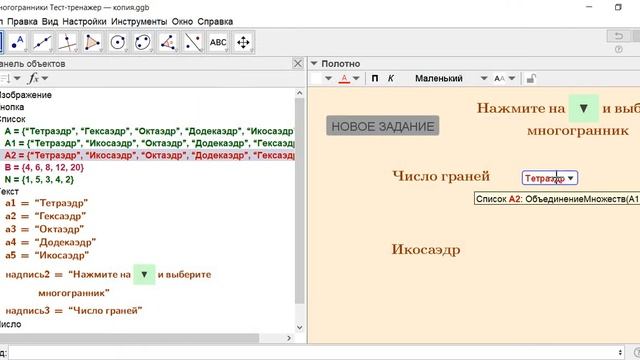 #GeoGebra #ЕленаСтародубцева #ГеоГебра #ГеоГебраОнлайн #GeoGebraOnLine Если число граней равно 20, то это гексаэдр или додекаэдр, а может икосаэдр? Как сделать тренажер, чтоб выбрать правильный ответ из предложенных? Вот для этого и существует выпадающий список. Мой сайт https://sites.google.com/view/trainers-in-matem/