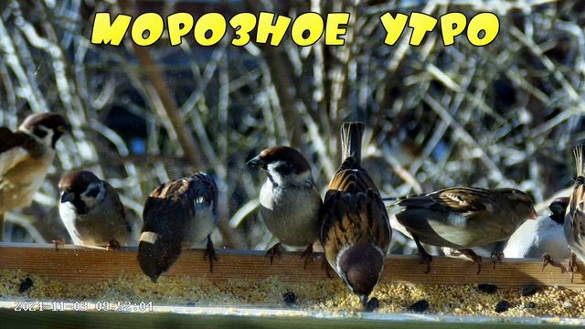 Морозное утро в кормушке с воробьями