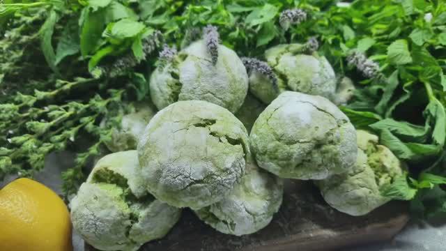 Нам понадобится: 1. Мята — 30г (листья) 2. Сахар - 100г 3. Лимонный сок - 1 ст. л. 4. Вода - 30-40г (я добавляла в блендер) 5. Яйцо - 1шт. 6. Сливочное масло - 90г 7. Ванилин или ванильный сахар - 1 пакетик 8. Мука — 350г 9. Разрыхлитель для теста — 1 ч. л. 10. Соль - 1 щепотка 11. Сахарная пудра — для обваливания 12. Растительное масло - смазать противень - Достаём сливочное масло заранее. Масло должно быть мягкое. - Свежую мяту промыть, просушить. - В блендере измельчаем листья мяты, 100г сахара, 1 ст. л. лимонного сока, немного воды. - Затем туда же добавляем 1 яйцо, 90г сливочного масла, ванилин, хорошенько перемешиваем. - В глубокую чашу просеиваем муку, добавляем 1ч. л. разрыхлителя, щепотку соли, перемешиваем и вливаем мятную смесь, замешиваем мягкое, нелипкое тесто. - После того, как тесто замесили, кладём его в пакет и убираем в морозилку на 30 минут. - Через 30 минут достаём наше тесто, и начинаем формировать печенье. Отщипываем кусочки, скатываем в шарики, обваливаем в сахарной пудре. - Пергамент смазываем растительным маслом и выкладываем на него наше печенье. Каждое печенье слегка придавливаем. - Выпекаем печенье в разогретой до 180 градусов духовке 20 минут. Красивое и вкусное мятное печенье готово!!! Приятного аппетита!!!😋😋😋