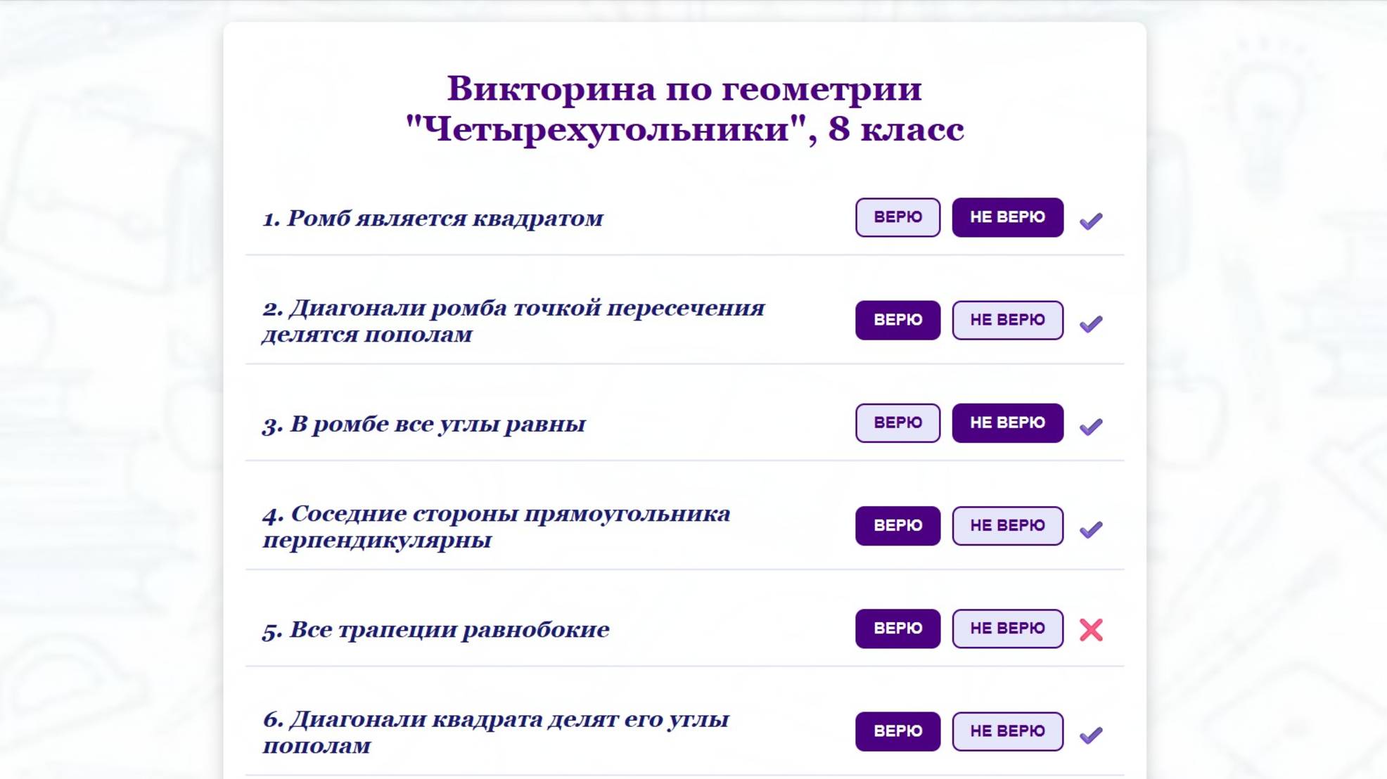 HTML Тренажер по геометрии для 8 класса "Четырехугольники"