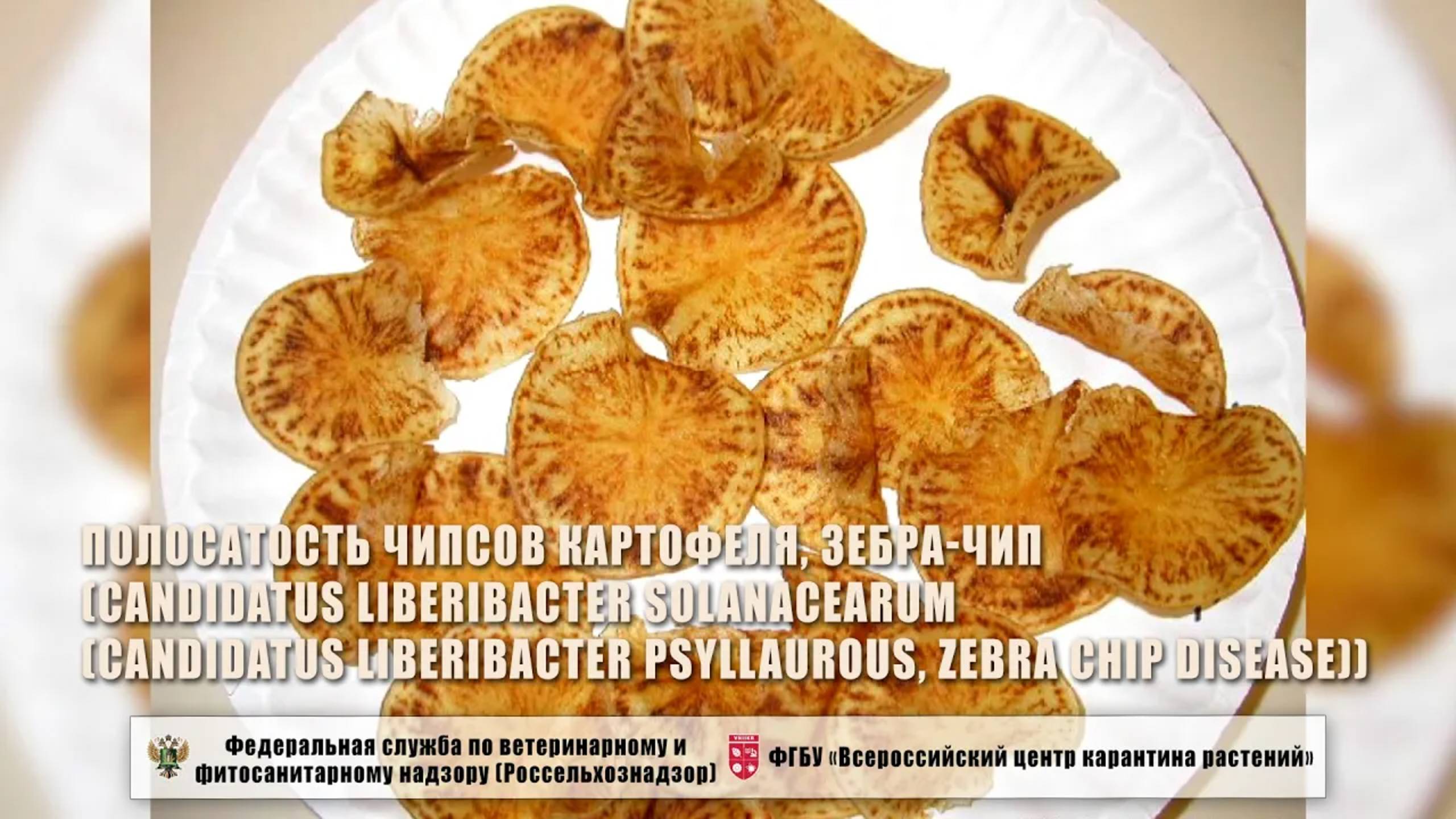 Полосатость чипсов картофеля, Зебра-чип (Candidatus Liberibacter solanacearum (Candidatus Liberibacter psyllaurous, Zebra Chip Disease)) Полосатость чипсов картофеля, Зебра-чип, Candidatus Liberibacter solanacearum – опасный фитопатоген растений. Основные растения-хозяева – картофель, томат, перец, а также поражаются баклажан, тамарилло, физалис, табак, морковь, сельдерей, петрушка, фенхель, пастернак.