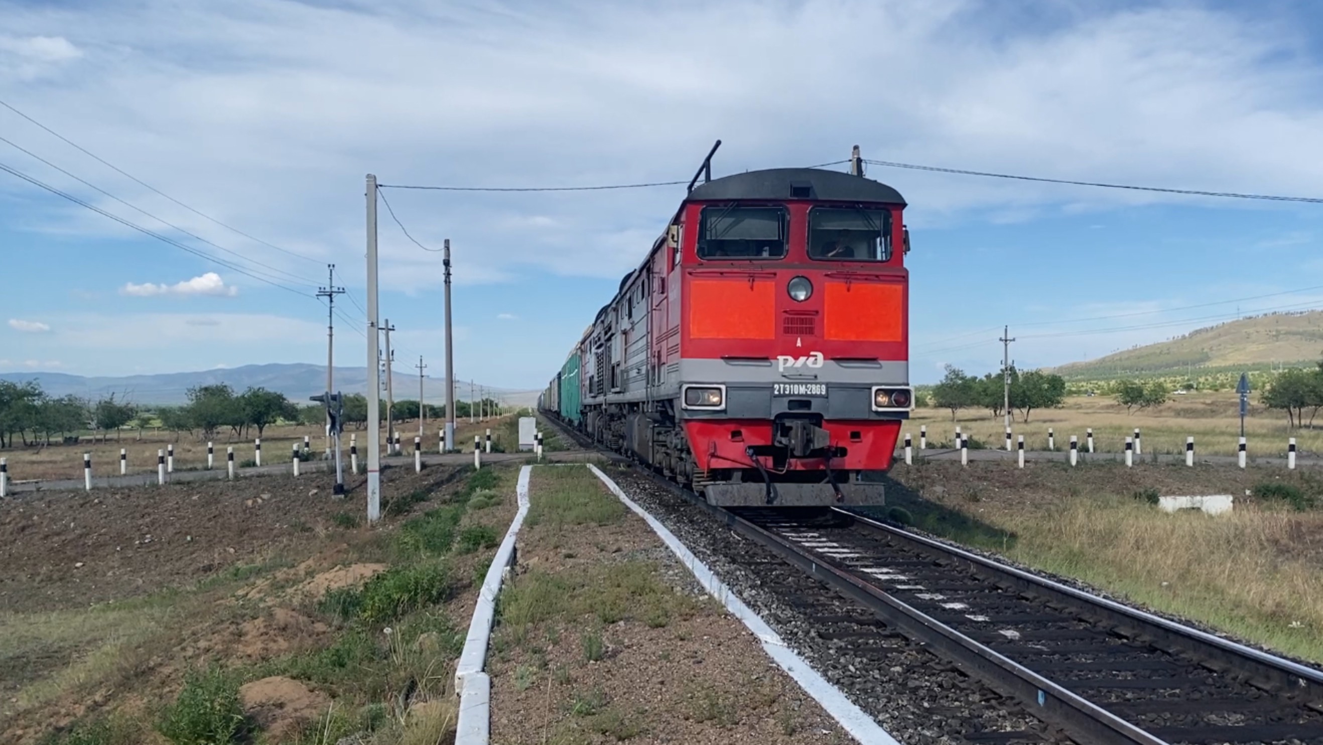 2ТЭ10М-2869 с грузовым составом следует из Улан-Удэ на юг через о.п. 5728 км рядом с поселком Нижний Убукун, Селенгинский район, Республика Бурятия. Обсудить с нами в Телеграме: https://t.me/rail38chat