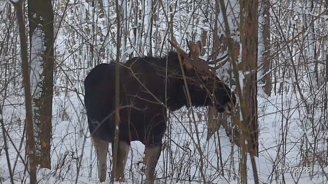 Ещё один лось - лось-пятигодка (он ещё не сбросил свои рога и сделает это, скорее всего. в феврале) - мирно пасся вчера (11/01/2026) в зоне отдыха "Лесная" в лесном квартале у улицы Ахунской. Подходил за веточками кустиков подлеска вплотную к главное дорожке-тропе этого лесного квартала и как будто совсем не боялся проходивших изредка мимо людей - только поднимал ненадолго голову и смотрел: не опасны ли люди для него? "Нет. Похоже, что не опасны" - и он продолжал свою неспешную мирную трапезу. Следы, оставленные этим лосем-пятигодкой на снегу, рассказали мне спустя два дня, что весь остаток дня и ночи 11/1/2026 он проплутал всё в том же лесном квартале вокруг освещённой главной дорожки-тропы (это было частью лыжной трассы 1970-х, электрическое освещение её было установлено тогда же) и весь следующий день пропадал где-то там же, постепенно передвигаясь по лесопарку в сторону 226-й школы и "бастилий" на ул. Светлой, а 13-го января утром двинулся оттуда к перекрёстку пр-та 30-летия Победы с ул. Заречной, пересёк его, пересёк лесной квартал до церкви, потом ул. Соборную, прошёл мимо мотодрома, дошёл до Профилакторского оврага (Чемодана-2), попасся вдоль него по хорошо утоптанной тропе и залёг там рядом отдыхать в снегу, не обращая внимание на изредка проходящих мимо прогуливающихся людей с собаками и без. Один из всего трёх оставшихся в Заречном лосей мужского пола. ... Тем временем лось-11-летка тоже оставил зону отдыха "Лесная" и отбыл в неизвестном направлении. ... "Лесная" осталась без лосей. Днём 15-го января этот же лось-пятигодка опять пасся в лесном массиве зоны отдыха "Лесная" у улицы Светлая. На его голове уже не было рогов слева. Остались только рога справа. Скоро, скоро он сбросит и их.