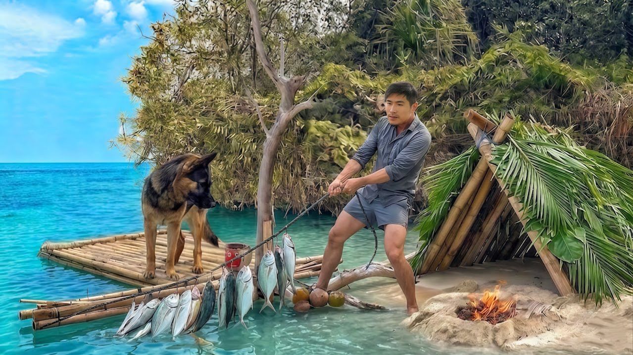 «Выживание на острове» (2-я серия) | Строим плот из мусора, ловим рыбу и готовим вместе с собакой