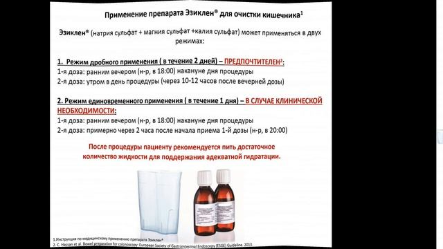 Эзиклен для подготовки к колоноскопии Эзиклен является осмотическим слабительным средством. Механизм действия препарата в первую очередь обусловлен ограниченным по насыщаемости процессом активного транспорта сульфатов. При достижении порога насыщения всасывания сульфаты остаются в просвете кишечника. Осмотический эффект неабсорбированых сульфатов и прием внутрь значительного объема воды вызывает задержку воды в кишечнике, что обеспечивает слабительное действие, вызывая обильную водянистую диарею, и приводит к очищению кишечника. Показания к применению Препарат Эзиклен предназначен для очищения толстой кишки у взрослых пациентов при подготовке к эндоскопическому и радиологическому исследованию толстой кишки или к хирургическим вмешательствам, требующим отсутствия содержимого в толстой кишке. Противопоказания Гиперчувствительность к действующим веществам или к любому из компонентов препарата Желудочно-кишечная обструкция или подозрение на желудочно-кишечную обструкцию Перфорация кишечника Нарушения опорожнения желудка, в том числе, гастропарез Кишечная непроходимость Токсический колит или токсический мегаколон Профузная рвота Дегидратация тяжелой степени Застойная сердечная недостаточность Асцит Тяжелая почечная недостаточность , скорость клубочковой фильтрации менее 30 Активная фаза воспалительных заболеваний кишечника , таких, как болезнь Крона, язвенный колит Беременность и период грудного вскармливания Детский возраст до 18 лет