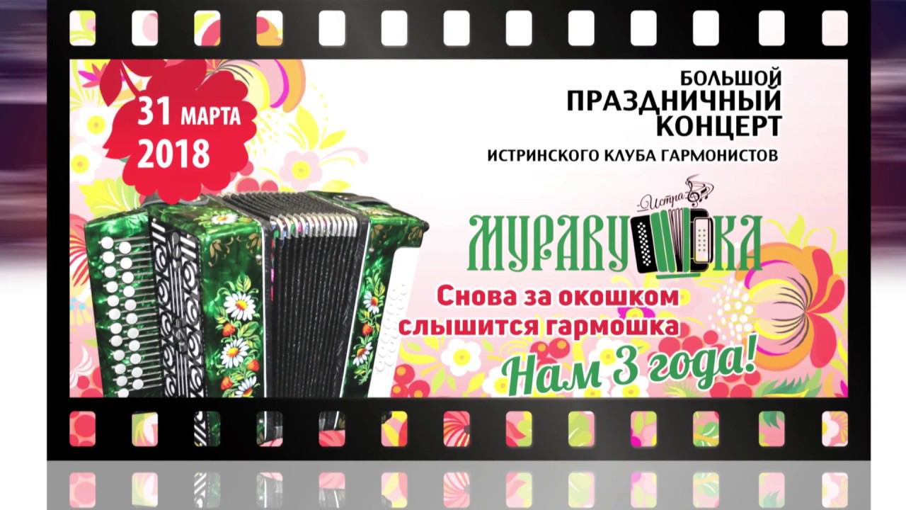Концерт организован Международным клубом " Муравушка" руководитель Валерий Болотов!! Три года назад 18 апреля 2015 года состоялся первый концерт и рождение Истринского клуба гармонистов "Муравушка". Своё двухлетие истринский клуб встретил и перешел в статус - творческий центр. Я как организатор и руководитель международного центра хотел бы поблагодарить всех кто все эти годы поддерживал и был рядом. Особенно я хотел бы выразить благодарность постоянным членам "Муравушки": Геннадий Аксенов, Рашид Зиников, Михаил Сёмин, Николай Вишняков, Алексей Медведев, Алексей Симонов, Андрей Ивлиев, Логачевы Сергей и Любовь, Юрий Богатырев, народный ансамбль "Калина" (Алексей и Нина Кондрашины, Оксана Салтанова), Геннадий Сюрсин, Алексей Ефимов, Наталья и Николай Вельмиские, Станислав Соловьев, Валентину Морозову - с уважением ко всем Валерий Болотов. Я снимаю игру на гармони, людей которым нравится русская гармонь! 6492293@mail.ru