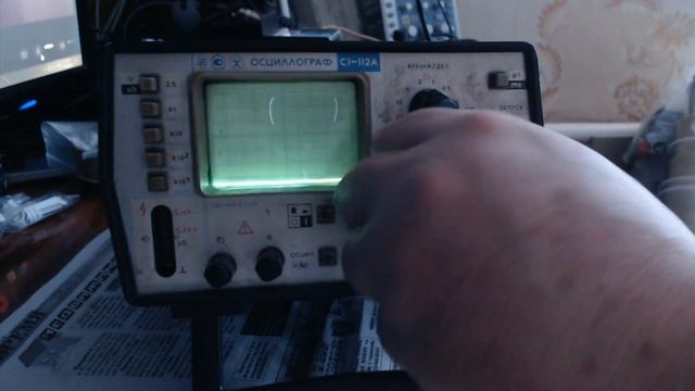 Старый Советский осциллограф С1-112А. -------------------------------------------------------------------------------------------------------------------- Основные параметры осциллографа С1-112 Полоса пропускания 0…10МГц Чувствительность 5мВ/дел ТВ-синхронизация (кадровыми синхроимпульсами) Встроенный цифровой мультиметр Измерение постоянного напряжения до 1000В и сопротивления постоянному току до 2.5 МОм Компактный (ЭЛТ 40х60мм) Масса 3,6кг ------------------------------------------------------------------------------------------------------------------- Назначение С1-112 Осциллограф-мультиметр С1-112А предназначен для исследования и измерения сигналов в режиме осциллографа и в режиме мультиметра. В осциллографическом режиме исследуются сигналы в амплитудном диапазоне от 5мВ до 250В и во временном диапазоне от 120нс до 0.5с с частотой до 10МГц. В режиме мультиметра измеряется напряжение постоянного тока от 1мВ до 1000В и активные сопротивления от 1Ом до 2.5МОм с цифровым отсчетом на экране ЭЛТ. Прибор рассчитан на использование в лабораторных и цеховых условиях.