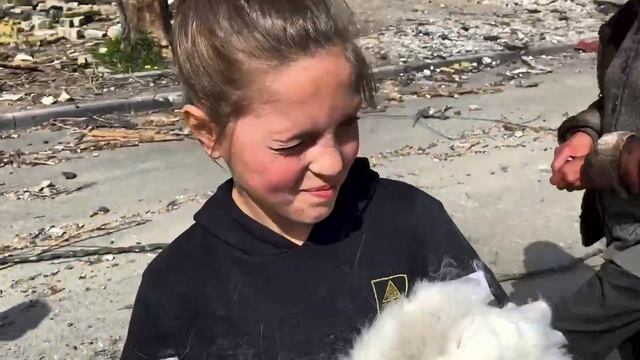 Мариуполь. Девочка с белым кроликом и солдаты России.