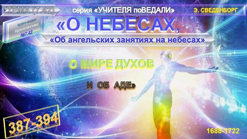 "ОБ АНГЕЛЬСКИХ ЗАНЯТИЯХ НА НЕБЕСАХ." (пп387-394) Книга О НЕБЕСАХ, О МИРЕ ДУХОВ И ОБ АДЕ, Эммануила Сведенборга (1688-1722). Знаменитый теософ и мистик Эммануил Сведенборг в этом самом содержательном и любопытном своем труде изложил полученные им Знания посмертного существования, описывая различные Божественные Высшие, Ангельские Тонкие и иные миры, а также их Обитателей, включая мир Ада... Е.П. Блаватская высоко ценила труды Э. Сведенборга, прежде всего как теософа, называя его великим провидцем. Данный Книга содержит записи автора, имеющие сквозную нумерацию от 1 по 360. Все записи сгруппированы и представлены по-порядку изложения в соответствующем их тематике подразделе." Книги "О НЕБЕСАХ, О МИРЕ ДУХОВ И ОБ АДЕ"-Эммануила Сведенборга. Знаменитый теософ и мистик Эммануил Сведенборг (1688—1722) в этом самом содержательном и любопытном своем труде изложил полученные им Знания посмертного существования, описывая различные Божественные Высшие, Ангельские Тонкие и иные миры, а также их Обитателей, включая мир Ада... Данный Книга содержит записи автора, имеющие сквозную нумерацию от 1 по 360. Все записи сгруппированы и представлены по-порядку изложения в соответствующем их тематике подразделе.