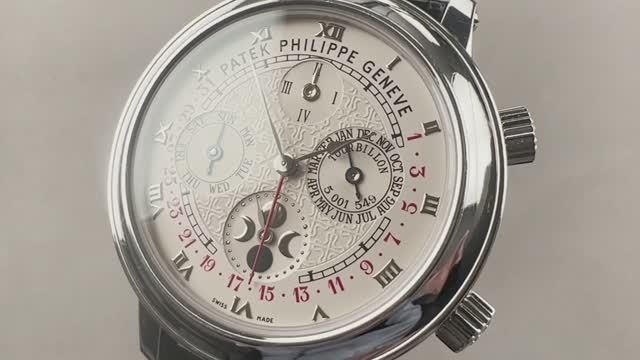 *видео переведено в Яндекс браузере… Patek Philippe Sky Moon Tourbillon 5002P-001 заключен в корпус 42,8 мм из платины, окружающий серебряный циферблат на блестящем черном ремешке из кожи аллигатора. Особенности этого Patek Philippe Sky Moon Tourbillon включают в себя минутный ретранслятор, вечный календарь, турбийон, небесный свод и т. д. Эти часы Patek Philippe имеют толщину 18,2 мм и 52,8 мм от наконечника до наконечника. *цена от 96.000.000 до 130.000.000 рублей на вторичном рынке Для получения полной информации посмотрите обзор Patek Philippe Sky Moon Tourbillon