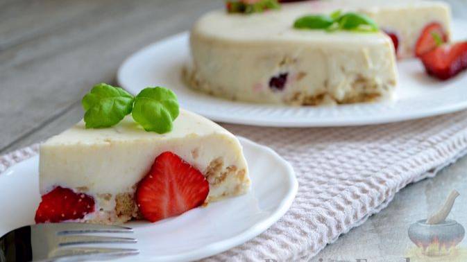 Оригинальное желе из сметаны и сгущёнки с добавлением измельчённого печенья. Нежный десерт прекрасно дополняют сочные и ароматные ягоды клубники. #ТортБезВыпечки #ТортЖеле #ТортСКлубникой