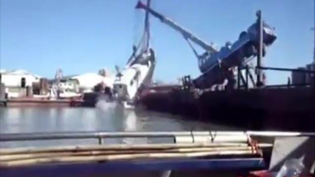 Кран не удержал катер и свалился в воду