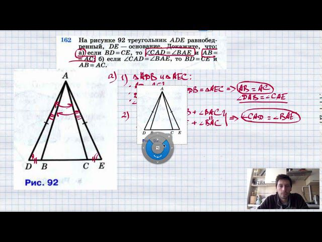 №162. На рисунке 92 треугольник ADE равнобедренный, DE — основание. Докажите, что: а) если BD=CE, то ∠CAD=∠BAE и AB=АС; б) если ∠CAD=∠BAE, то BD = CE и AB=АС. TikTok - https://vm.tiktok.com/WJJwK9 Like - https://likee.com/user/@ge0metriya Мой второй канал для подготовки к ЕГЭ и ОГЭ - https://www.youtube.com/ЕвгенийСумин Инстаграм - https://www.instagram.com/EGE_OGE.math Личный инстаграм - https://www.instagram.com/ee_sumin VK - https://vk.com/evgeniysumin FB - https://www.facebook.com/EvgeniySumin