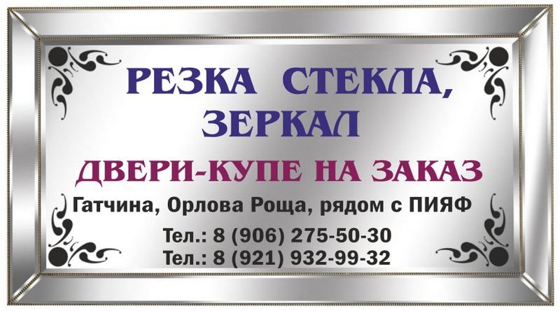 РЕЗКА СТЕКЛА И ЗЕРКАЛ: - Оконное (2, 4 мм) - Витринное (5, 6 мм) - Узорчатое (б/цв, брон.) - Матовое, бронза - Обработка кромки, сверление отверстий - Нанесение пескоструйного рисунка - ДВЕРИ-КУПЕ НА ЗАКАЗ Ленинградская область, г. Гатчина, Орлова роща, рядом с ПИЯФ. Самовывоз по рабочим дням с 10 до 18 час., без обеда. Предварительно необходимо уточнить готовность заказа по телефонам: Тел.: 8 (906) 275-50-30 Тел.: 8 (921) 932-99-32 Для юр. лиц и ИП отгрузка осуществляется при наличии печати или доверенности. Email: 9329932@rambler.ru; ВКонтаке: vk.com/steklo_gatchina Часы работы с 10:00 до 18:00, СБ, ВСК - выходные