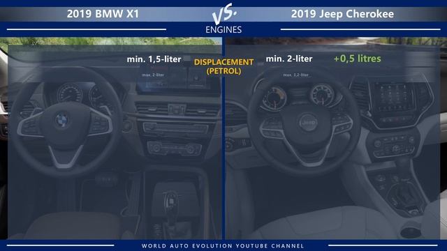 Welcome to the video comparison between BMW X1 vs Jeep Cherokee. Please note that this is only a technical comparison, based solely on technical data of both cars. Not a real life 2019 BMW X1 vs 2019 Jeep Cherokee review. In this video, you can find the differences between X1 vs Cherokee in the following categories: ➜ External dimensions (length, width, height, wheelbase, ground clearance) ➜ Interior dimensions (head room, leg room, shoulder room) ➜ Cargo volume/luggage compartment, weight ➜ Maximum power, maximum torque, top speed, acceleration 0-100 km/h / 0-62 mph ➜ Safety (Euro NCAP crash test results) ➜ Price (USA, Germany, UK). ★ ★ Join My Patreon Community ➜ https://www.patreon.com/worldautoevolution ★ ★ My Favorite YouTube Tool TubeBuddy ★ ★ Download TubeBuddy Free Today! ➜ https://www.tubebuddy.com/worldautoevolution ★ Don't forget to Subscribe ➜ https://www.youtube.com/channel/UCq_A5jZZ8fcbdWzLW6AZHGA?sub_confirmation=1 ★ ★ ★ Credits: ★ ★ ➜ Music: Inner Light by Kevin MacLeod is licensed under a Creative Commons Attribution license (https://creativecommons.org/licenses/by/4.0/) Source: http://incompetech.com/music/royalty-free/index.html?isrc=USUAN1300021 Artist: http://incompetech.com/ ➜ Original images are taken from the manufacturers and/or Euro NCAP press releases and transformed/resized for the purpose of research and comparison. Thank you for your visit! We hope to see you again! DISCLAIMER: This video description may contain affiliate links, which means that if you click on one of the product links, I’ll receive a small commission. This helps support the channel and allows me to continue to make videos like this. Thank you for the support! #BMWX1 #JeepCherokee #SUV #BMW #Jeep