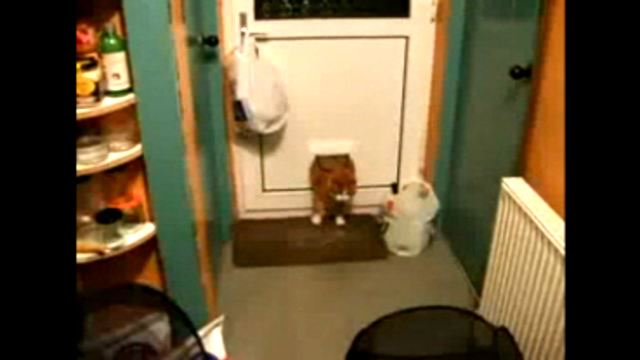 Кот застрял в двери, словно Винни-пух из одноименного мультика.