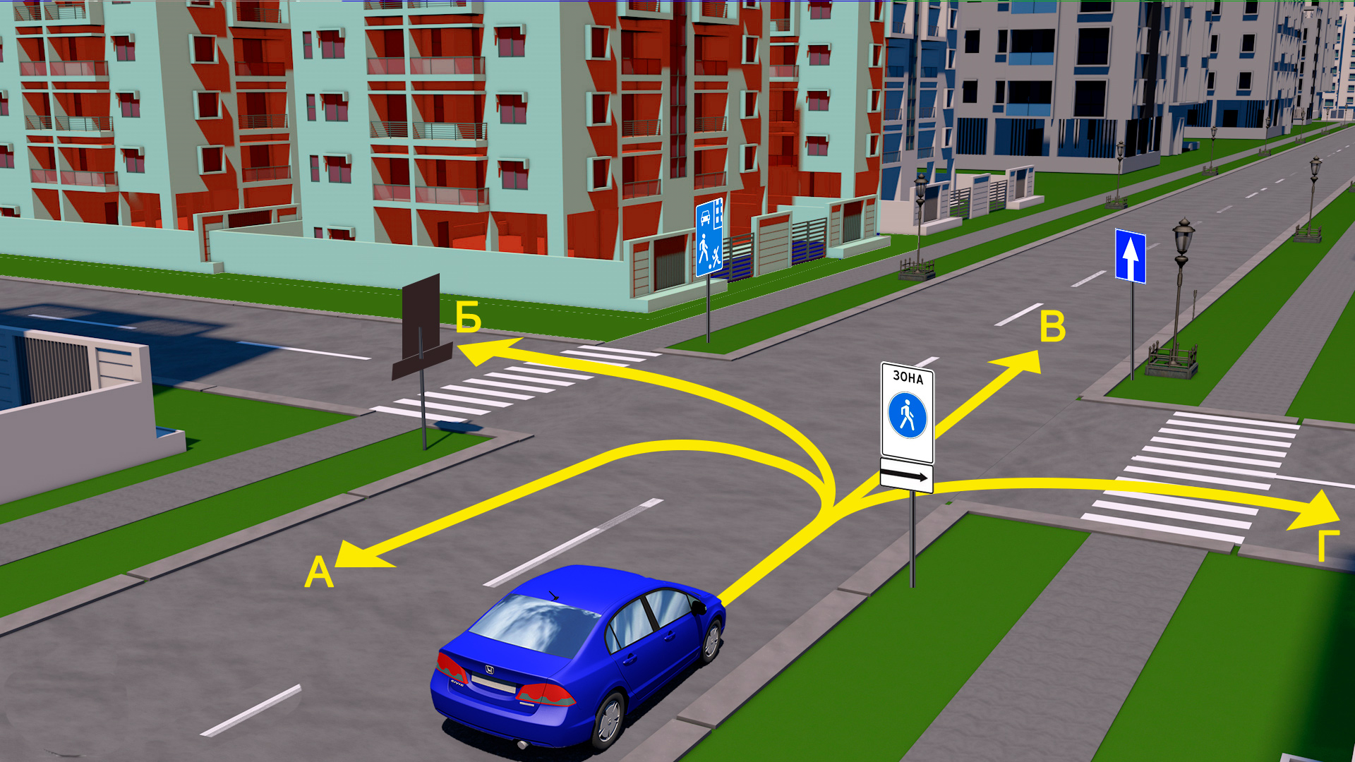 По какой траектории водителю разрешено продолжить движение? Определите разрешенные траектории в этой ситуации. Решите эту задачу и поделитесь ею с друзьями.
