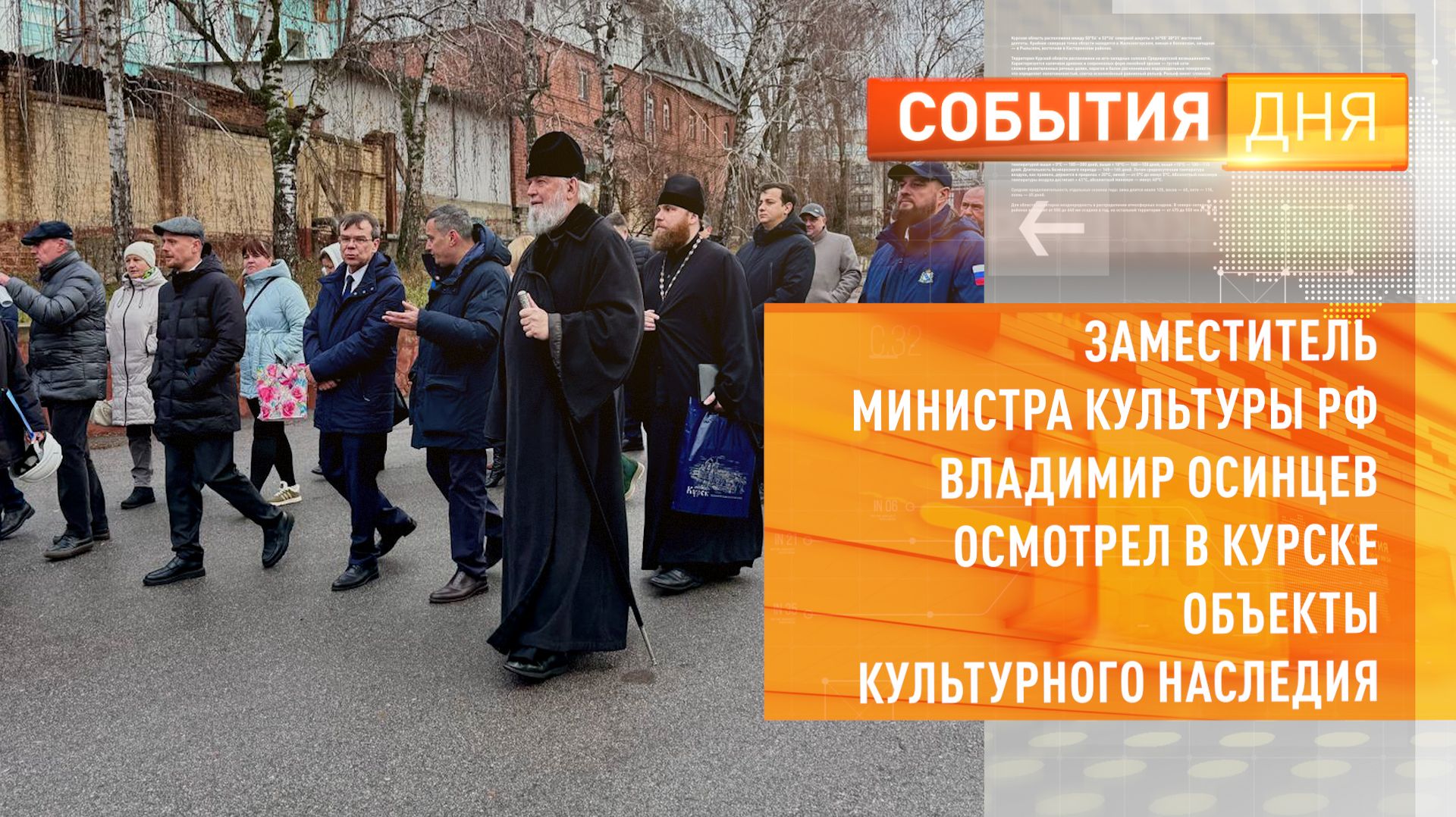 Курск посетил заместитель министра культуры России Владимир Осинцев. Он встретился с губернатором Александром Хинштейном, а также осмотрел объекты культурного наследия: Сергиево-Казанский кафедральный собор, Водонапорную башню, и здания, находящиеся на территории исторического центра «Курской крепости».