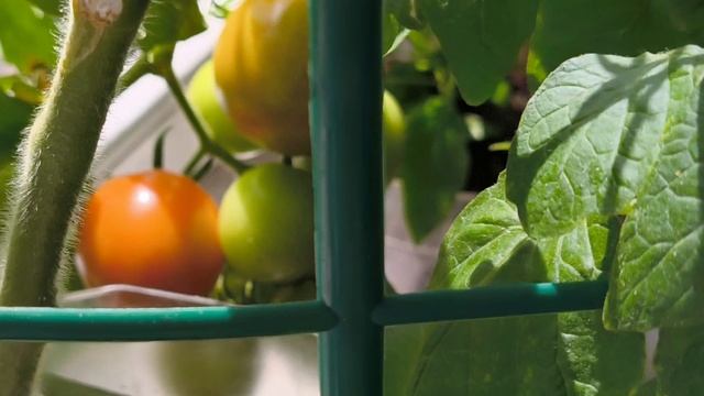 На подоконнике весьма внушительные помидорчики, растущие с выражением *я тебя сам съем*, а не бусинки мини-томатов, как было заявлено на упаковке
