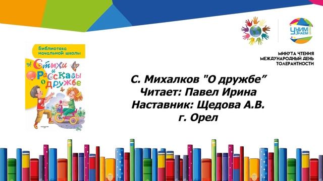 ЕЖЕДНЕВНО с 16 по 20 ноября в 18.00 Акция «Минута чтения», приуроченная к 25-летию Международного дня толерантности. Тематический раздел "Кто руку верную подаст?" Участвуют: Архипова Мария читает произведение Л.Н. Толстого. “Лев и собачка” Наставник: Мухорская Д.Д. (г. Чехов «Русское поле») Воробьева София читает произведение Я. Ципинской “Мы разные”. Наставник: Позднякова И.В. (Свердловская область) Восканян Армен читает произведение М. Самарского “Радуга для друга”. Наставники: Тищенко Л.В., Игнашина В. (г. Москва) Готфридт Кирилл читает произведение Ю.Белоусова “Дружба - это дар”. Наставник: Сороковых О.И. (Алтайский край) Дзодзуашвили Георгий читает произведение А. Милна “Винни-Пух”. Наставник: Мазаева Е.В. (г. Москва) Ильина Мария читает произведение Т. Дашкевич “Благородство”. Наставник: Уханова О.А. (г. Москва) Канева Любовь Ивановна, заведующий учебной частью, читает произведение Маргариты Алигер “Друг” (г. Москва) Крылов Макар читает произведение Т. Дашкевич “Благородство”. Наставник: Уханова О.А. (г. Москва) Макагон Михаил читает произведение С. Махотина “От друга в стороне”. Наставник: Калугина Л. А. (г. Москва) Набирухина Арина читает произведение Туве Янссон “Шляпа волшебника”. Наставник: Полякова Е.А. (г. Москва) Павел Ирина читает стихотворение С. Михалкова “О дружбе”. Наставник: Щедова А. В. (Орловская область) Перушкина Александра Павловна, тьютор, читает произведение Антуана де Сент-Экзюпери “Маленький принц” (г. Москва) Рубан Александр читает произведение М. Самарского “Радуга для друга”. Наставники: Тищенко Л.В., Игнашина В. (г. Москва) Уваров Михаил и Уварова Ирина Юрьевна, ученик и родитель, читают произведение С. Козлова “Ежик в тумане”. Наставник: Уханова О.А. (г. Москва) Федорова В. читает произведение Сергея Махотина “Ты смог бы без меня обойтись?”. Наставник: Зотина К.А. (г. Москва) Хмелевский Роман читает стихотворение Расула Гамзатова “Берегите друзей”. Наставник: Кропачева М.И. (Ленинградская область) Шагапова Ксения Олеговна, тьютор, читает стихотворение Эдуарда Асадова “Самое прочное на земле” (Красноярский край) Широва Мария Феликсовна, тьютор, читает стихотворение Эдуарда Асадова “Самое прочное на земле” (г. Москва) Шпакова Нелли читает произведение Т. Швайгера “Безухий заяц и ушастый цыпленок”. Наставник: Катцова А.П. (г. Москва)