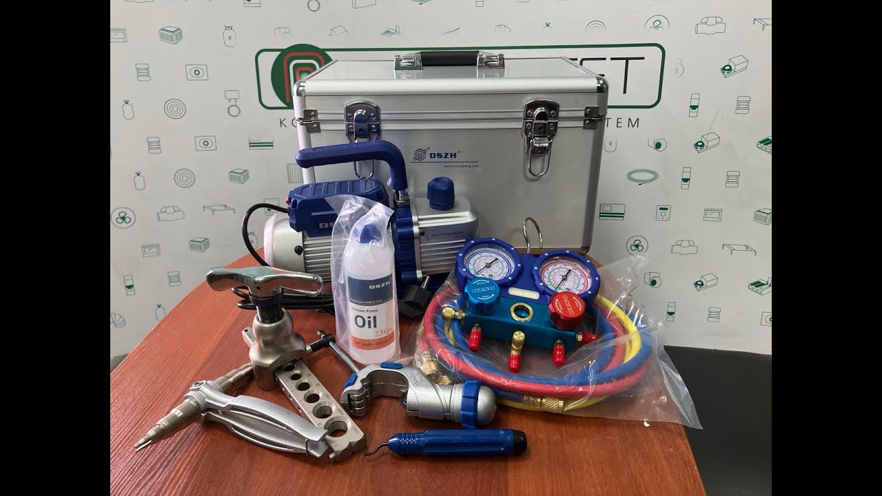 Набор инструментов для монтажа кондиционеров DSZH WK-7P Очень удобный алюминевый кейс в него входят основные инструменты для монтажа фреонопровода 1. Вакуумный насос WK-115N 2. Риммер CT-207 3. Манометрический коллектор двухвентильный WK-6003S 4. Шланги заправочные CT-360-PYB-P 5. Развальцовщик WK-809 6. Труборез WK-532 7. Труборасширитель WK-622