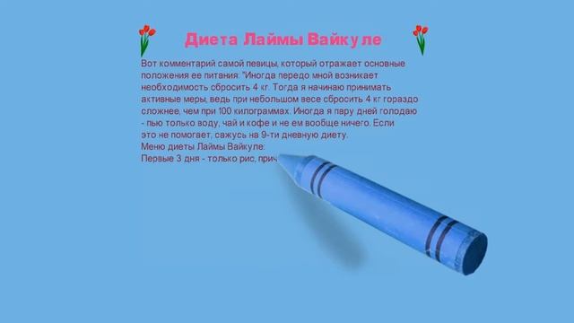 Основы здорового питания:http://vk.cc/4G0SnH \\\\\\\\\\\\\\\\\\\\\\\\\\\\\\\\\\\\\\\\\\\\\\\\\\\\\\\\\\\\\\\\\\\\\\\\\ Содержание видео: Диета Лаймы Вайкуле \\\\\\\\\\\\\\\\\\\\\\\\\\\\\\\\\\\\\\\\\\\\\\\\\\\\\\\\\\\\\\\\\\\\\\\\\ Похудение это начало новой жизни, если вы пришли к мысли что вам пора худеть, значит вы на правильной дороге. Похудеть это значит помочь своему организму. Похудеть это значит сделать свою жизнь радостней и прекрасней. Похудеть это значит забыть о своих недугах и стать прекрасной.Не забывайте, что похудение должно проходить разумно. Не нужно мучить свой организм безумными диетами и не подьёмными физическими занятиями. Разумные диеты и разумное занятие спортом. Вот залог вашего похудения. И не забываем и про силу воли которая поможет вам преодолеть все невзгоды в похудении. А невзгод будет очень много .Начиная от плохого настроения до желания всё бросить и пойти скушать вкусный тортик. Так что силы Вам побольше и похудеть вы сможете без проблем На нашем канале вы узнаете ответы на такие вопросы как - как похудеть,как правильно похудеть, как похудеть без диет, как похудеть сохранив здоровье, правильное питание, здоровый образ жизни, как похудеть и навсегда забыть про диеты, похудение без диет без фитнеса и без таблеток. Программа диеты на кашах: https://www.youtube.com/playlist?list=PLci693nd4zMO7B-bcq8lOoxg3l4JVPkqk -Программа диеты от звёзд: https://www.youtube.com/playlist?playnext=1&list=PLci693nd4zMMo6mTqmBUc1rKlg5bhmE_S -Программа диеты для похудения: https://www.youtube.com/playlist?playnext=1&list=PLci693nd4zMNaH1PAXuqmkJi7CF4E2qBH Программа авторские диеты: https://www.youtube.com/playlist?list=PLci693nd4zMPw7CKlzTwj8XY7kry8x4ca -Подпишитесь: https://www.youtube.com/channel/UCh0o9mjNvFjstJLE3H0amzA?sub_confirmation=1 Информация с сайта http://fotodiet.ru/ Бесплатный курс по YouTube от Конодена: http://superpartnerka.biz/shop/112 Академия YouTube от Конодена: http://superpartnerka.biz/shop/113 Каталог курсов от Евгения Попова: http://p.cscore.ru/s/19707