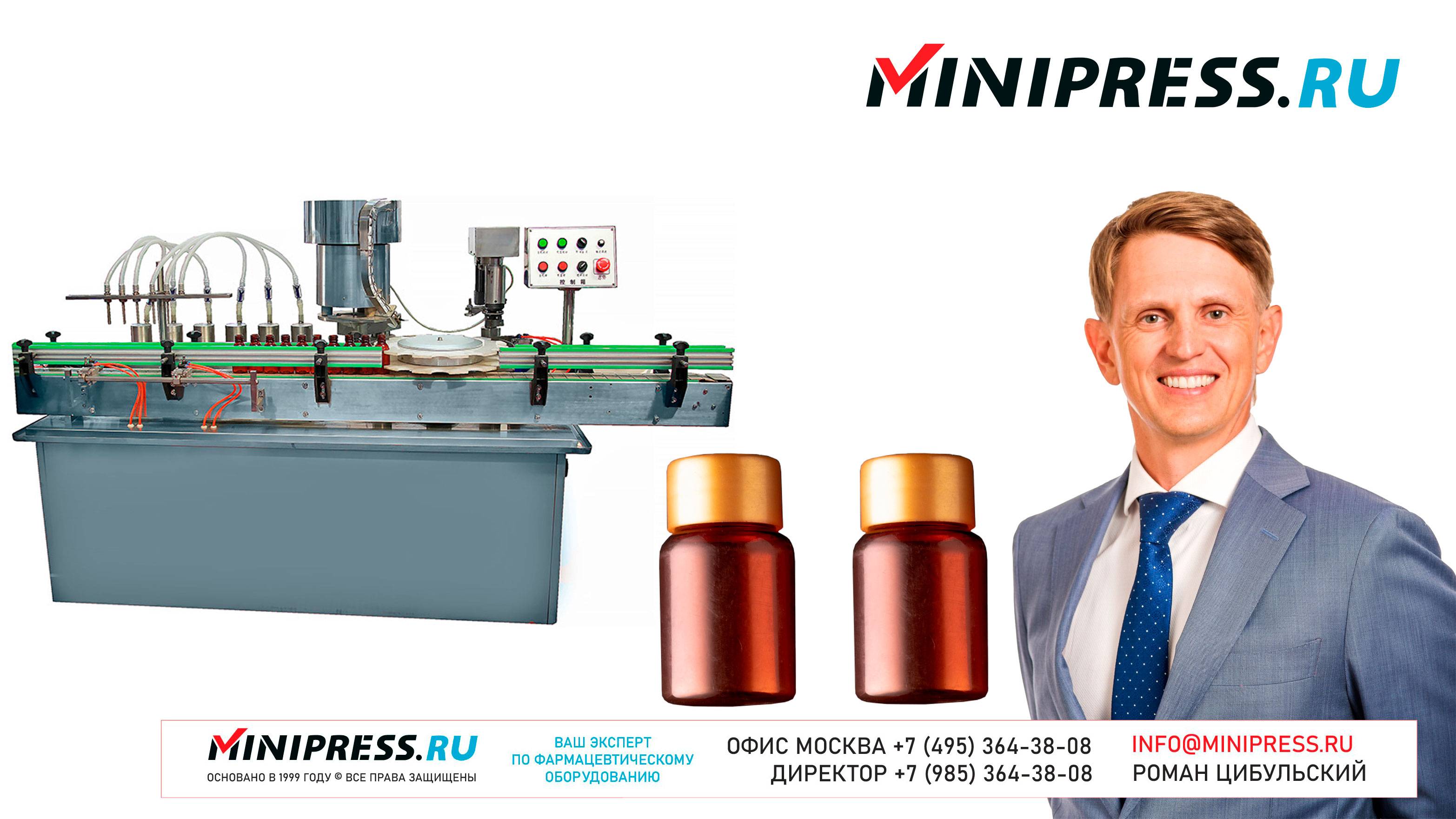 Машина розлива и укупорки пластиковых флаконов GF-04 https://Minipress.ru/katalog/ Фармацевтическое оборудование. Специалисты в фармацевтическом оборудовании и технологиях производства лекарств. Более 20 лет оказываем нашим клиентам помощь в выборе, поставке, наладке различного фармацевтического оборудования! Вы в поиске надежного поставщика оборудования? Мы предоставим вам лучший сервис 24/7. Собрана лучшая команда профессионалов в фармацевтической отрасли и налажены стабильные связи с лучшими производителями. Мы не только продаем, но и производим многие модели оборудования Директор компании Минипресс Роман Цибульский Поставка фармацевтического оборудования в Россию Пишите: info@minipress.ru Телефон +7(495)364-38-08; Мобильный +375(29)308-00-00 Россия, Москва Skype: RomanTsibulsky; ICQ: 310-134-490 Подписывайтесь на наш видео канал на Youtube https://youtube.com/user/wwwMinipressru Обновленный сайт https://Minipress.ru Каталог оборудования https://Minipress.ru/katalog/ МЫ В СОЦИАЛЬНЫХ СЕТЯХ G+ https://plus.google.com/+RomanTsibulsky/ FB https://facebook.com/roman.tsibulsky YOUTUBE https://youtube.com/user/wwwMinipressru IN https://ru.linkedin.com/pub/roman-tsibulsky/a6/933/661 БОЛЬШОЙ КАТАЛОГ ФАРМАЦЕВТИЧЕСКОГО ОБОРУДОВАНИЯ https://minipress.ru/katalog/ Постоянно обновляемый каталог различного фармацевтического оборудования с фотографиями, описаниями, видео и ценами. ПЕРСОНАЛЬНЫЙ МЕНЕДЖЕР 24 ЧАСА https://minipress.ru/katalog/ Вы общаетесь по всем вопросам, с момента первой консультации и до получения оборудования, с одним специалистом. СПЕЦИАЛИСТЫ И ТЕХНОЛОГИ https://minipress.ru/katalog/ Имеем обширные связи в фармацевтической среде, найдем любого специалиста, поможем с освоением оборудования и технологий. ОБСУЖДЕНИЕ ВАШИХ ИДЕЙ ПО ПРОИЗВОДСТВУ ПРОДУКЦИИ https://minipress.ru/katalog/ Поможем в оценке ваших идей. Большой опыт в организации различных производств и выпуске продукции. Ценные советы. ФАРМАЦЕВТИЧЕСКОЕ ОБОРУДОВАНИЕ Мы поставили перед собой задачу, помогать нашим клиентам в правильном выборе фармацевтического оборудования. Многолетний опыт подобной деятельности показывает, что многие клиенты сталкиваются, в первую очередь, с непониманием технологического процесса. Покупка оборудования должна быть финальной точкой после подробного обсуждения задачи, консультацией с производителем оборудования, отправкой сырья и материалов на фабрику, тестирования в работе. ДЛЯ ТАБЛЕТОК https://minipress.ru/katalog/category/farmacevticheskoe_oborudovanie/ Смешивание порошков, гранулирование, прессование, обеспыливание, покрытие оболочками, фасовка, упаковка, счет, нанесение логотипов ДЛЯ ЖЕЛАТИНОВЫХ КАПСУЛ https://minipress.ru/katalog/category/farmacevticheskoe_oborudovanie/kapsulyatory-dlya-tverdyh-zhelatinovyh-kapsul/ Фасовка порошков и масел, обеспыливание, счет и фасовка, упаковка, нанесение логотипов. ФАСОВКА И УПАКОВКА https://minipress.ru/katalog/category/upakovochnoe_oborudovanie/ Упаковка в пластиковые и стеклянные флаконы, блистер, фольгу, ламинированную бумагу, стеклянные ампулы, саше, стрипы, тубы, тюбики, контурную ячейку. ТЕХНОЛОГИЧЕСКОЕ https://minipress.ru/katalog/category/eksperimentalnoe-oborudovanie/ Лабораторное, аналитическое, подготовительное, отдельные машины и линии под ключ. СФЕРЫ ДЕЯТЕЛЬНОСТИ Наша компания занимается множеством направлений фармацевтического бизнеса! Предлагаем Вам посетить страницы нашего сайта https://www.Minipress.ru по различным специализациям. ОБОРУДОВАНИЕ ДЛЯ НАКЛЕЙКИ ЭТИКЕТОК НА БУТЫЛКИ АМПУЛЫ ФЛАКОНЫ https://minipress.ru/katalog/oborudovanie-s-otzyvami/oborudovanie-dlya-naklejki-etiketok-na-butylki-ampuly-flakony/ Автоматическое этикетировочное оборудование для этикеток на клеевой основ