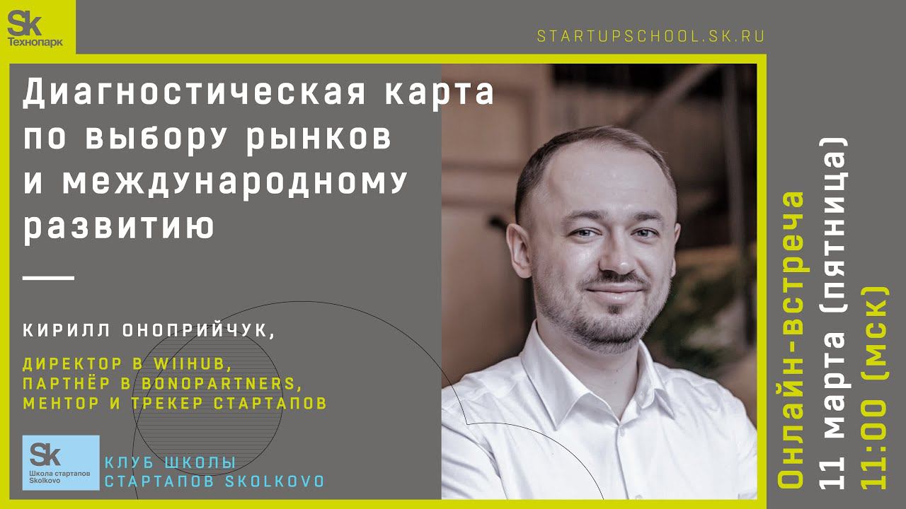 00:00:00-00:03:10 - приветствие, несколько слов о курсе "Международные рынки" (подробности о курсе и подача заявок на участие здесь: https://startupschool.sk.ru/global-startup) 00:03:10-01:06:32 - лекция "Диагностическая карта по выбору рынков и международному развитию" 01:06:32-01:55:11 - вопросы-ответы О чём лекция? - Обзор рынков и регионов для выхода («плюсы» и «минусы» разных регионов) - Диагностическая карта по выбору рынков и международному развитию - Ключевые моменты для успешного выхода и основные ошибки компаний - 5 основных шагов успешного выхода. Обзор инструментов для выхода - Матрица по выходу. Воркшоп по заполнению Спикер: Кирилл Оноприйчук, директор в WiiHub, партнёр в BonoPartners, ментор и трекер стартапов. Презентация спикера доступна по ссылке: https://drive.google.com/file/d/1w9nmUPkwHvI-16hG1MSYapfNdYY3FJ_3/view?usp=sharing Приглашаем присоединиться к сообществу Школы стартапов Skolkovo в Телеграм: https://t.me/startupschoolsk __ Команда Школы стартапов Skolkovo, startupschool.sk.ru
