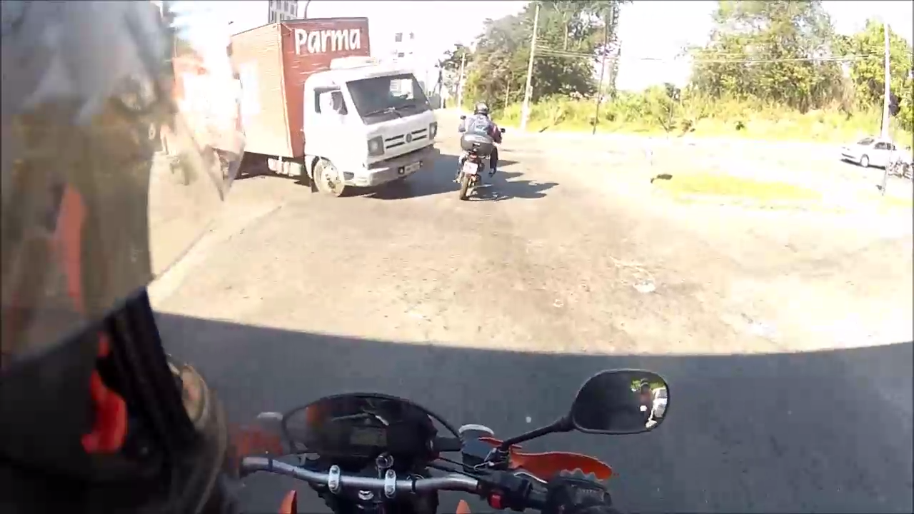 В Бразилии мотоциклист на перекрестке решил поскорее проехать и чуть не попал под колеса грузовика - отделавшись лишь небольшой аварией. #мотоцикл #перекресток #грузовик