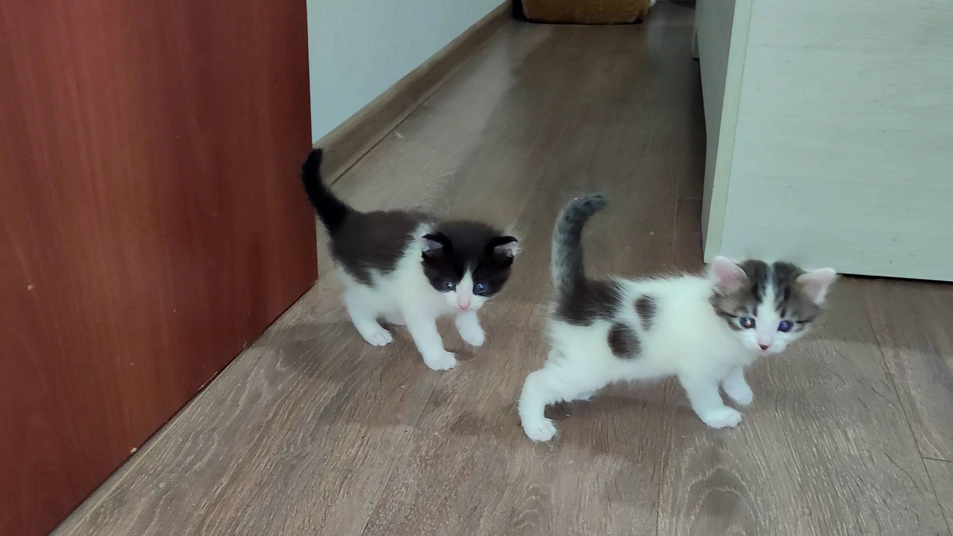 Мама-кошка зовет своих котят идти с ней. Котята мяукают.