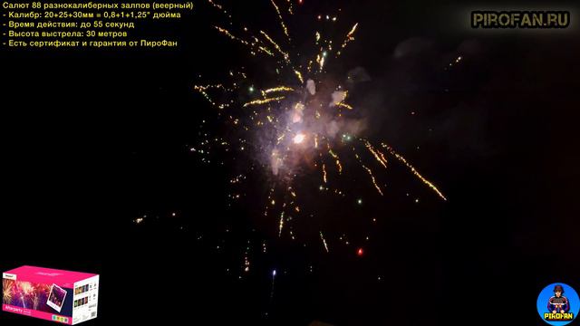 https://avito.ru/brands/PiroFan - ОФИЦИАЛЬНЫЙ магазин Русской компании ПироФан Салют 88 разнокалиберных залпов After Party (веерный) - Калибр: 20+25+30мм = 0,8+1+1,25" дюйма - Время действия: 55 секунд - Высота выстрела: до 35 метров - Есть сертификат и гарантия от ПироФан
