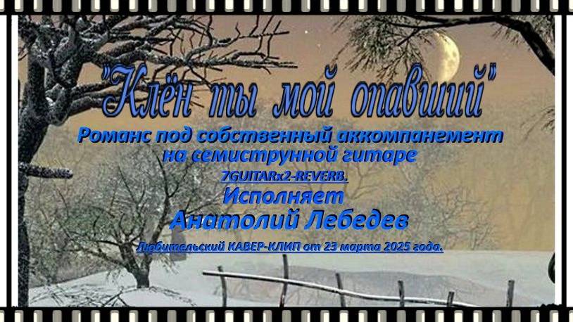 Анатолий Лебедев из Питера. ЛЮБИТЕЛЬСКОЕ ВИДЕО Анатолия Лебедева с его исполнением романса "КЛЁН ТЫ МОЙ ОПАВШИЙ" под собственный аккомпанемент на семиструнной гитаре. Слова - СЕРГЕЯ ЕСЕНИНА 91925 г.) Музыка - В.Н.ШЕВЧЕНКО. В данном видео в исполнении А. Лебедева звучит мелодия на музыку В.ЛИПАТОВА. Видеозапись исполнения романса сделана А. Лебедевым 21 марта 2025 года. Улучшение исполнения 7GUITARx2-VOC-вок и монтаж видеоролика сделаны А. Лебедевым 24 марта 2025 года.