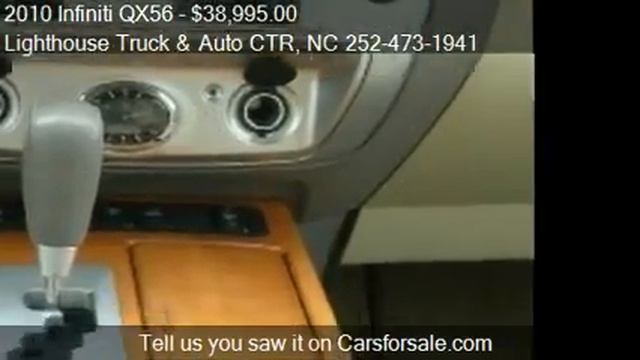 Lighthouse Truck & Auto CTR 720 hwy 64 in Manteo, NC 27954 Come test drive this 2010 Infiniti QX56 RWD for sale in Manteo, NC. http://www.obxlighthouseauto.com You wont find any electrical problems with this vehicle. Vehicle is defect free. We have found no door dings on this vehicle. There is a properly functioning engine in this vehicle. The exterior finish on this automobile is clean. The condition of the interior is clean. The mileage is accurate. Great, smooth shifting transmission. Option List:ABS Brakes,Adjustable Foot Pedals,Air Conditioning,Alloy Wheels,AM/FM Radio,Anti-Brake System: 4-Wheel ABS,Automatic Headlights,Automatic Load-Leveling,Body Style: SPORT UTILITY 4-DR,Cargo Area Tiedowns,Cargo Volume: 61.40 cu.ft.,CD Changer,CD Player,Child Safety Door Locks,Chrome Wheels,Cruise Control,Curb Weight-automatic: 5705 lbs,Deep Tinted Glass,Driver Airbag,Driver Multi-Adjustable Power Seat,Electrochromic Exterior Rearview Mirror,Electrochromic Interior Rearview Mirror,Electronic Brake Assistance,Electronic Parking Aid,Engine Type: 5.6L V8 DOHC 32V,Fog Lights,Front Air Dam,Front Brake Type: Disc,Front Headroom: 39.70 in.,Front Heated Seat,Front Hip Room: 61.30 in.,Front Legroom: 41.80 in.,Front Power Lumbar Support,Front Power Memory Seat,Front Shoulder Room: 65.10 in.,Front Side Airbag,Front Spring Type: Coil,Front Suspension: Ind,Fuel Economy-city: 12 miles/gallon,Fuel Economy-highway: 18 miles/gallon,Full Size Spare Tire,Genuine Wood Trim,Ground Clearance: 8.30 in.,Heated Exterior Mirror,Heated Steering Wheel,High Intensity Discharge Headlights,Interval Wipers,Keyless Entry,Leather Seat,Leather Steering Wheel,Load Bearing Exterior Rack,Manual Sunroof,Maximum GVWR: 7150 lbs,Maximum Payload: 1445 lbs,Maximum Towing: 9000 lbs,Navigation Aid,Optional Seating: 8,Overall Height: 77.80 in.,Overall Length: 206.90 in.,Overall Width: 78.80 in.,Passenger Airbag,Passenger Multi-Adjustable Power Seat,Power Adjustable Exterior Mirror,Power Door Locks,Power Sunroof,Power Trunk Lid,Power Windows,Rear Brake Type: Disc,Rear Headroom: 40.00 in.,Rear Hip Room: 60.10 in.,Rear Legroom: 41.90 in.,Rear Shoulder Room: 64.50 in.,Rear Spring Type: Coil,Rear Suspension: Ind,Rear Window Defogger,Rear Wiper,Running Boards,Second Row Folding Seat,Second Row Heated Seat,Second Row Sound Controls,Separate Driver/Front Passenger Climate Controls,Side Head Curtain Airbag,Standard GVWR: 7150 lbs,Standard Payload: 1445 lbs,Standard Seating: 7,Steering Type: R&P,Steering Wheel Mounted Controls,Subwoofer,Tachometer,Tank: 28.00 gallon,Third Row Removable Seat,Tilt Steering,Tilt Steering Column,Tire Pressure Monitor,Tires: 275/60R20,Track Front: 67.50 in.,Track Rear: 67.50 in.,Traction Control,Trip Computer,Turning Diameter: 40.80 in.,Vehicle Anti-Theft,Vehicle Stability Control System,Wheelbase: 123.20 in.,2 Wheel Drive,4 Door,Antilock Brakes,Anti-theft,Automatic w/overdrive Transmission,Bucket Seats,Center Console,Driver Air Bag,Dual Climate Control,DVD Player,Heated Seats,Information Center,Leather Seats,Luggage Rack,Navigation System,Park Assist/Back Up Camera and Monitor,Passenger Air Bag,Power 3rd Row Seat,Power Liftgate,Power Mirrors,Power Seats,Power Steering,Rear Air Conditioning,Rear Defrost,Rear Stereo,Satellite Radio,Side Air Bags,Steering Wheel Controls,Tinted Windows,Towing Package,Trip/Mileage Computer Provided by Carsforsale.com http://video.carsforsale.com/vehiclevideo.aspx?vid=176813678