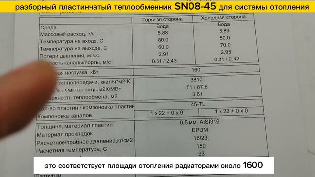 Пластинчатый разборный теплообменник SN08-45 для работы в системах отопления Аппарат для применения в системе отопления обладает следующими характеристиками: 1. Тепловая нагрузка 160 кВт 2. Горячая сторона. Вход: 80С, Выход: 60С 3. Холодная сторона (вода) Вход: 50С, Выход: 70С 4. Патрубки: Ду32 , нар.резьба 5. Поверхность теплообмена (3,61м2) - 45 пластин 6. Площадь отопления 1600 м2 ✅ Пластины теплообменника изготовлены из нерж. стали - AISI316 ✅ Высокие рабочие характеристики: макс. рабочее давление - 16 бар., макс. рабочая температура - 150С. ✅ Гарантия 3 Года ✅ Разборная конструкция позволяет легко промывать и обслуживать теплообменник. Мы производим пластинчатые теплообменники с 2009 года, поэтому можем предложить вам лучшие условия: ? - Предложим цену на 30% ниже рынка! ??️ - Изготовим ваш теплообменник за 1 день! ? - Надежно упакуем и доставим оборудование на ваш объект! ?? - Доставим теплообменник в любую точку России! ? - Расчет теплообменников ведется в сертифицированной программе расчета. Подберем на любую мощность и посчитаем за 15 минут! ? - Постоянная сервисная поддержка!