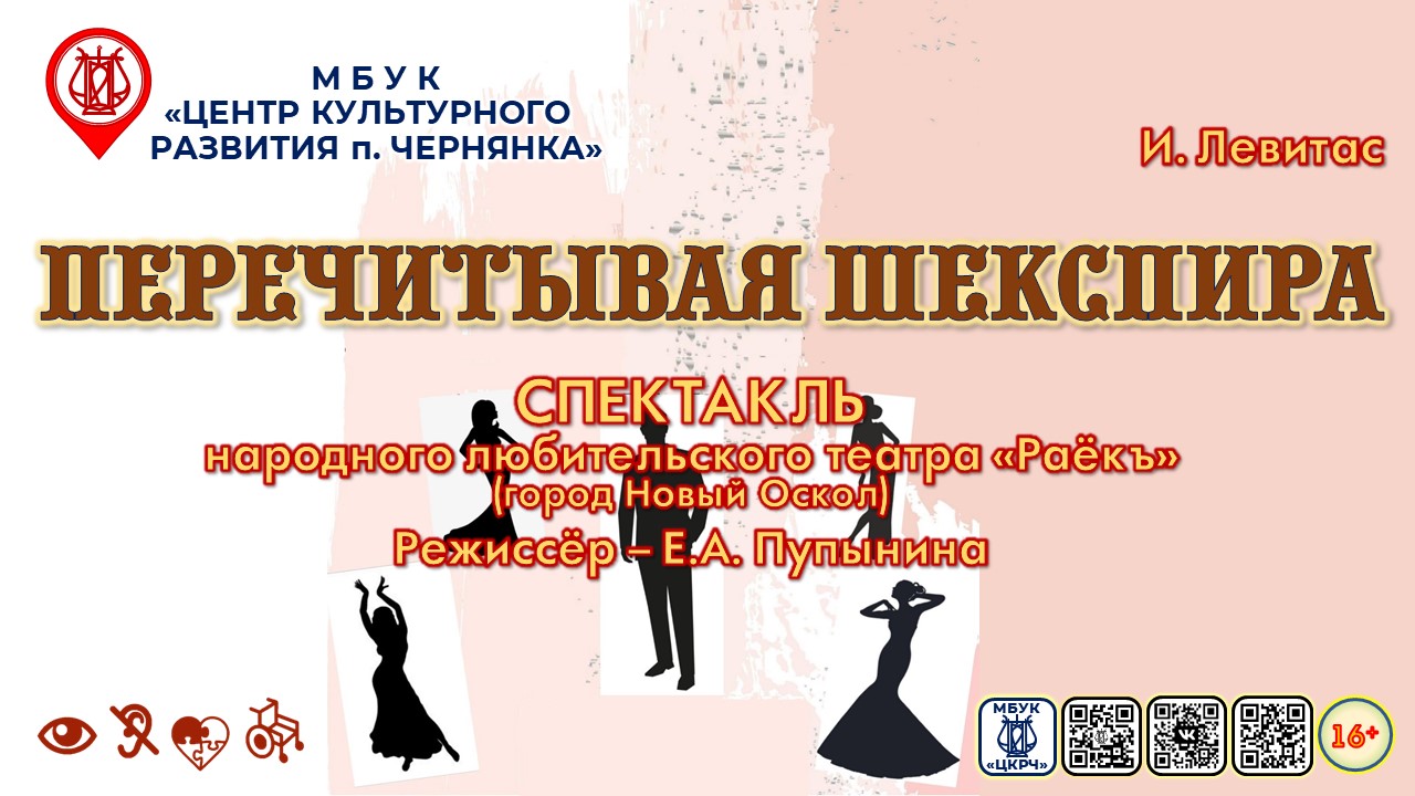 19.11.2022, МБУК "ЦКРЧ", зрительный зал 19 ноября на сцене Центра культурного развития п.Чернянка дарил свое творчество Народный любительский театр "Раёкъ" г. Новый Оскол (режиссёр Е. Пупынина). Для жителей посёлка Чернянка был показан интригующий спектакль "Перечитывая Шекспира" (автор И. Левитас). Благодарим наших друзей Центр культурного развития "Оскол" г.Новый Оскол за сотрудничество ?. Будем рады видеть Вас снова в наших стенах!