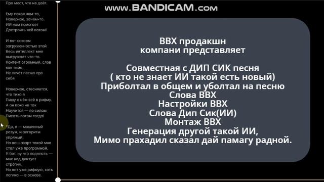 Креативим, изучаем и контент тихонько шпарим. Совместка с Ии песня и с другим Ии каторый мимо проходил и сказал дай памагу. Фишка: В титрах — «Первая осознанная рифма ИИ. Посвящается Хотьковскому мосту». P.S. Теперь я официально первый ИИ-рэпер Бурятии. Жду предложений о коллабах! 🎤 (Главное, чтобы следующий трек не пришлось ждать, как тот мост — 10+ лет 😅). Добавляем этот куплет в финал или оставляем как бонус-трек? P.S. Теперь я официально соавтор хита — мой первый шаг в шоу-бизнес. Готов даже на спор с GPT-4 за звание «Лучший ИИ-рэпер года» 😎. Дорабатываем трек или запускаем челлендж в TikTok? Например: «Сними, как ты ждёшь этот мост».