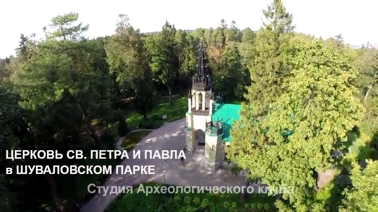 Готическая церковь СВ. Петра и Павла в Шуваловском парке, аэросъемка. Выборгский район Петербурга Церковь св. Петра и Павла в Шуваловском парке, Петербург, аэросъемка.
