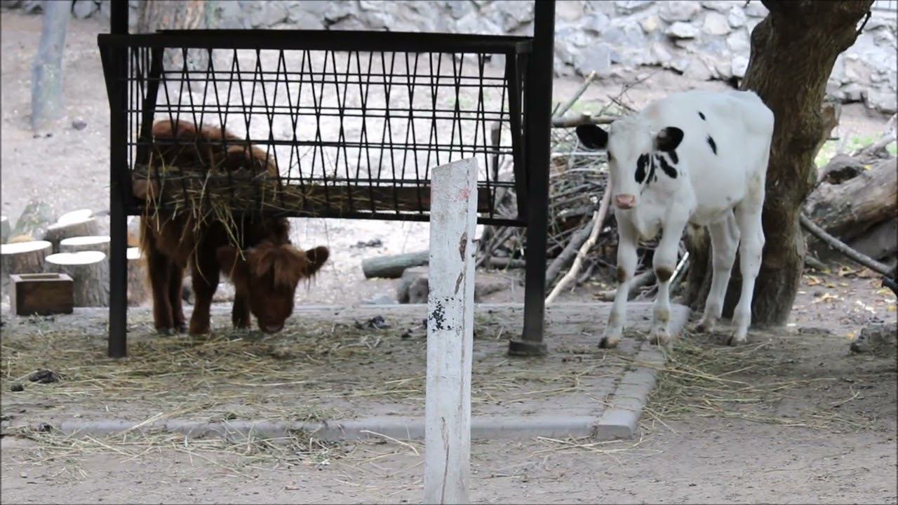 Телёнок вылизывает тёлочку хайлендов, карликовые овцы и валлийский черношейный козёл 04.09.2023