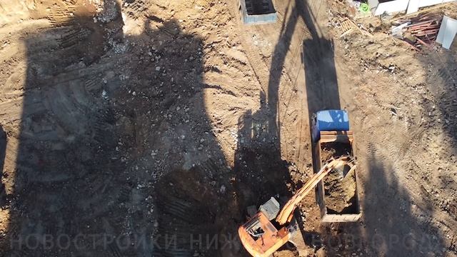 Видим как работает экскаватор на строительной площадке: экскаватор утрамбовывает песок в кузове самосвала, сверху это выглядит так, как в детской песочнице лопаткой уплотняют песок в формочки для куличиков :)
