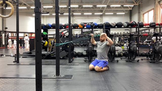 Тяга резины к лицу + вращение плеча наружу сидя на полу с паузой в конце