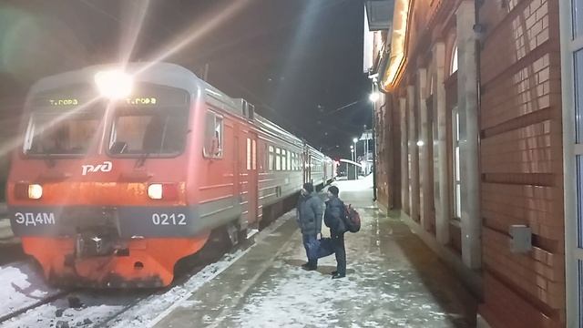 Электропоезд ЭД4М-0212 с пригородным поездом №7182 Чусовская - Теплая гора отправился с 1-го пути Перевозчик: АО «Пермская ПК» Ст. Чусовская, Пермский край, СВЖД Дата: 18.02.2024