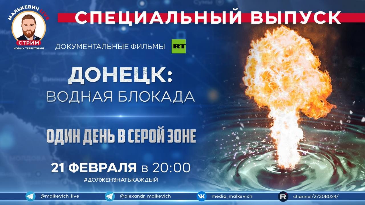 В рамках спецрубрики #ДолженЗнатьКаждый мы покажем два документальных фильма телеканала RTД (https://t.me/rtdru). ▪ Документальный фильм «Донецк: водная блокада». Почти год города Донбасса живут без бесперебойной подачи воды: в результате обстрелов украинской артиллерией была нарушена работа насосных, фильтровальных станций и котельных. Авторы фильма проехали по районам Донецка и других населённых пунктов, увидели, каким образом налажена подача питьевой воды в жилые дома, больницы и роддома, и встретились с волонтёрами, у которых, помимо доставки гуманитарной помощи, появился ещё один вид деятельности — бурение скважин. Также в фильме показана работа средств ПВО, которые отражают обстрелы противником жизненно важных объектов Донбасса. ▪ Документальный фильм «Один день в серой зоне». В этой семье – одни женщины: прабабушка, бабушка, мать и дочка-первоклассница. Работы в посёлке Зайцево нет, живут тем, что вырастили на огороде. На учёбу Маша ездит с мамой в соседнюю Никитовку. Что собирать урожай, что учиться в школе – это риск, в любой момент может прилететь пуля, снаряд или мина. Дети здесь уже привыкли к стрельбе, знают, чем отличается БТР от БМП. Они живут на войне, рисуют её, видят каждый день на выщербленных от пуль и осколков стенах школы и своих домов. Взрослые, как могут, стараются оградить их от всех этих ужасов. «Я хочу, чтобы закончилась война» - вот самая главная мечта Маши. Документальные фильмы «Донецк: водная блокада» и «Один день в серой зоне» ? Внимательного вам просмотра @malkevich_live