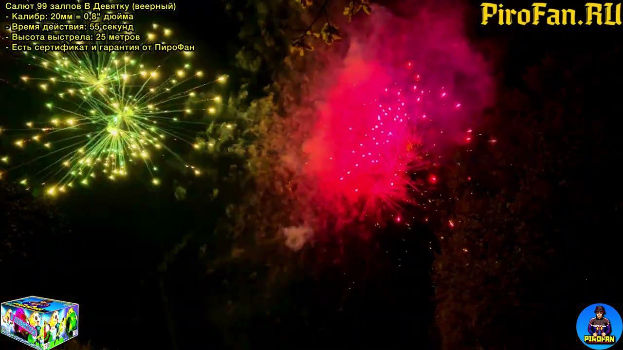 HTTPS://PIROFAN.RU - скидки в нашем официальный магазине ТКВ922/2 Салют 99 залпов средних, фейерверк В Девятку (веерный) - Калибр: 20мм = 0,8" дюйма - Время действия: 55 секунд - Высота выстрела: 25 метров - Есть сертификат и гарантия от Пирофан