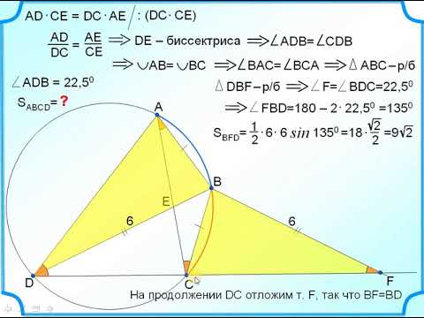 Диагонали вписанного в окружность четырехугольника ABCD пересекаются в точке Е, причем AD*СЕ=DС*АЕ, BD = 6, угол ADВ=22,5⁰. Найдите площадь четырехугольника ABCD.