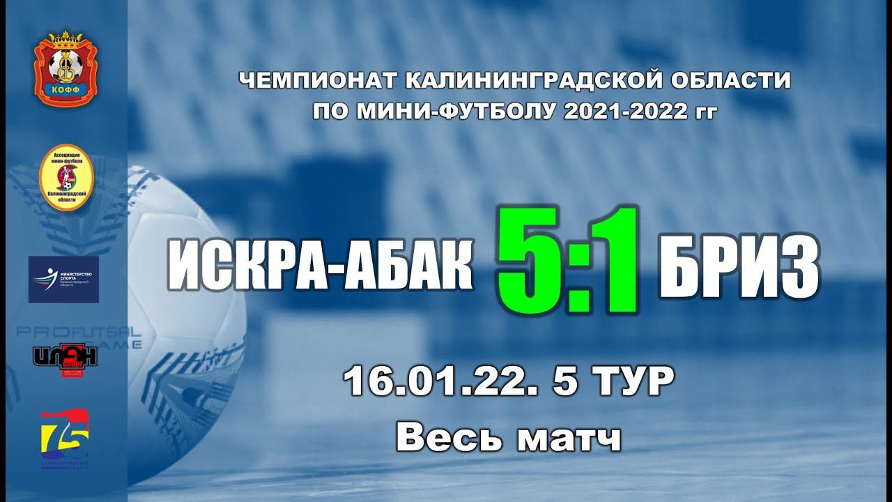 16.01.22. Чемпионат Калининградской области по мини-футболу 5-й тур. «Искра-АБАК» - «Бриз» 5:1 (4:1). Весь матч. Голы забили: С.Фазуллин (8'), П.Макаренко (8'), Г.Новиков (11'), Е.Ильюхин (16'), А.Дорморос (26') -- А.Крупин (16') Предупреждены: П.Макаренко (И), Г.Новиков (И) -- С.Старков (Б) Удалены: нет