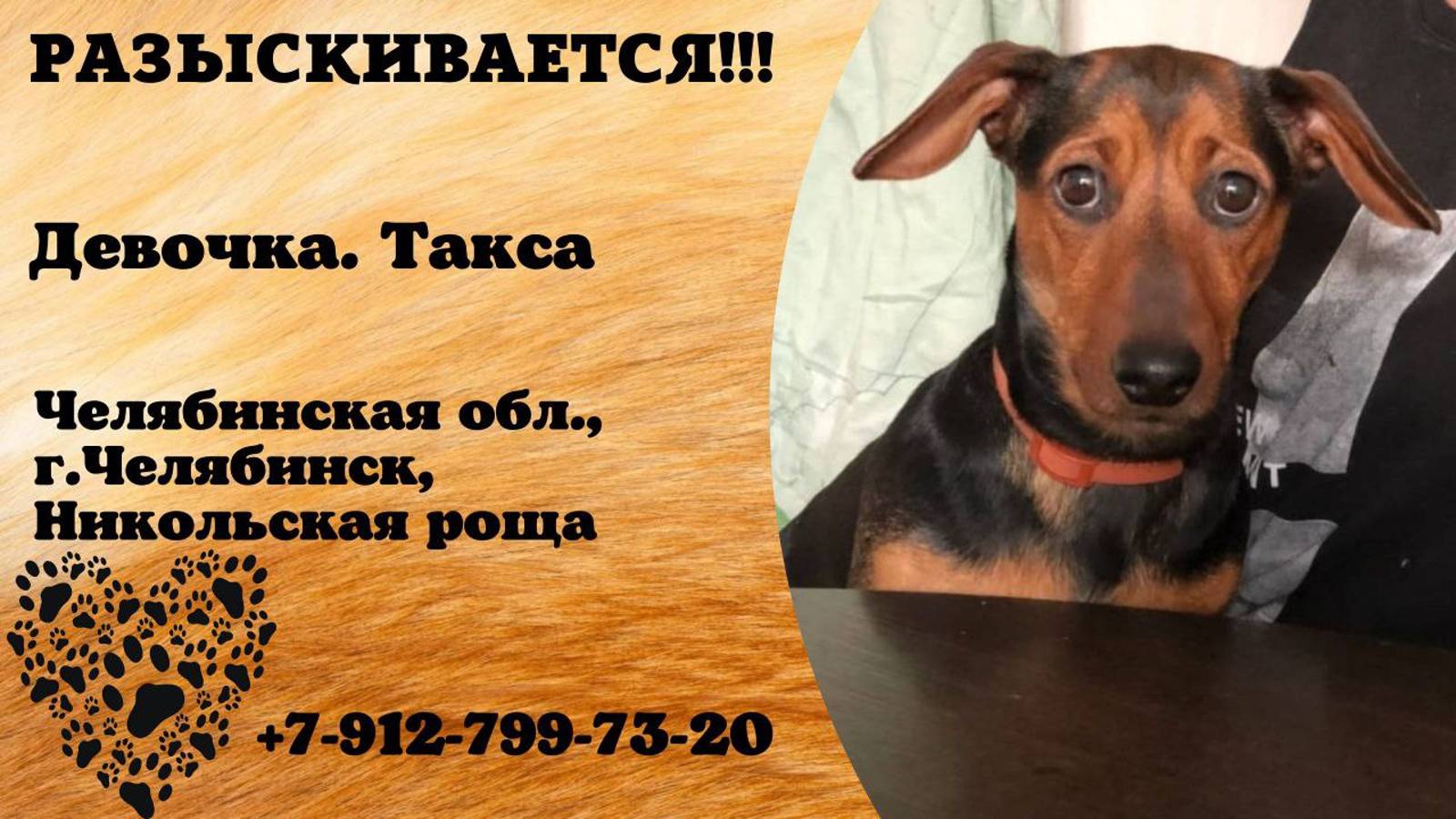 Челябинская Челябинск Пропала собака Потерялась такса 28.09.2024.В районе Никольская роща. Видели ее на Комарова. Сейчас может находится в районе Танкистов, Мамина или в СНТ Тракторосад. 89127997320. Инфо: https://vk.com/wall-198815410_155186 Автор: https://vk.com/id751610313