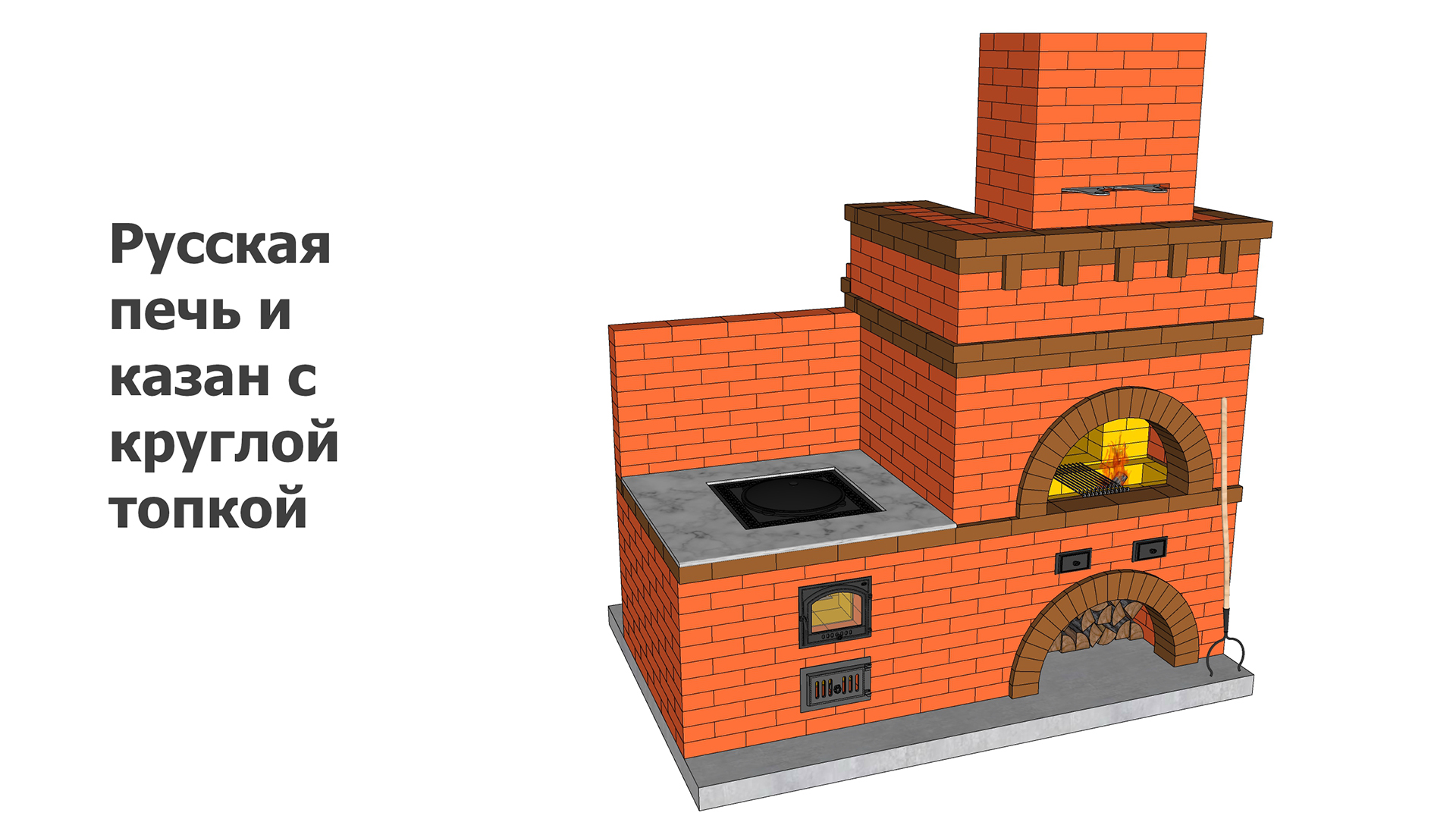 Данная порядовка казана с круглой шамотной топкой позволит использовать большие казаны на 20-22 литров. Особенностью данной порядовки является использование цилиндрической топки под казан из шамотного кирпича. Топливник круглой формы позволяет языкам пламени равномерно нагревать казан. В составе комплекса полная имитация русской печи с меньшими размерами пода 756 * 630 мм. Перед входом в русскую печь установлен мангал из шамотного кирпича для приготовления шашлыка. Проект по ссылке: https://stroikalife.ru/product/poryadovka-russkaya-pech-i-kazan-s-krugloj-topkoj/