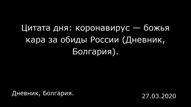 Пресса США https://www.youtube.com/playlist?list=PLK4bbBLT7WW549H298VRDFWCWKk0Ybc4a Пресса Украины https://www.youtube.com/playlist?list=PLK4bbBLT7WW5JspJT2JuBIYm94Es0D3XI Пресса Китая https://www.youtube.com/playlist?list=PLK4bbBLT7WW5zJPrror7LF5S0_E7vEXwx Пресса Германии https://www.youtube.com/playlist?list=PLK4bbBLT7WW6Ylh7J1Gn_zekI-qcLX8Xj Пресса Великобритании https://www.youtube.com/playlist?list=PLK4bbBLT7WW4cnsh4HRNaqCQDSOz-aC8N Пресса Франции Пресса Турции https://www.youtube.com/playlist?list=PLK4bbBLT7WW5qDpUjJuvTt03SLZinlRil А так же пресса: Молдавии, Казахстана, Кубы, КНДР, Палестины, Сингапура, Морокко, Узбекистана, Бельгии, Хорватии, Южной Кореи, Мексики, Судана, Колумбии, Ирака, Канады, ОАЭ, Туниса, Иордании, Грузии, Португалии, Болгарии, Эстонии, Австрии, Словакии, Литвы, Израиля, Сирии, Норвегии, Йемена, Белорусии, Азербайджана, Бахрейна, Катара, Сербии, Аргентины, Швейцарии, Ирана, Бразилии, Дании, Чехии, Польши, Латвии, Испании, Армении, Японии, Ливии, Ливана, Саудовской Аравии, Кувейта, Австралии, Египта, Финляндии, Швеции, Италии и других стран: https://www.youtube.com/view_all_playlists Дорогие слушатели! Подписка на наш канал окажет нам большую поддержку. Благодарим вас за неё! ПОДПИСЫВАЙТЕСЬ НА КАНАЛ: https://www.youtube.com/channel/UCDyxWZW6AabSOwwepI8_bGA?sub_confirmation=1 Цитата дня: коронавирус — божья кара за обиды России (Дневник, Болгария). Дневник, Болгария. 27.03.2020 «Все это произошло потому, что не надо обижать Россию и ее спортсменов. На мой взгляд, это (пандемия коронавируса) — божья кара», — заявила двукратная олимпийская чемпионка по спортивной гимнастике и бывший депутат Государственной думы от партии «Единая Россия» Светлана Хоркина в связи с переносом летних Олимпийских игр в Токио. «Не зря в нашем гимне поется „Хранимая Богом родная земля‟. Сейчас по всему миру бродит такая смертельная гадость, но не должно быть подобных политических переиначиваний. Россия по-прежнему готова помочь всем, потому что мы понимаем, что нет ничего лучше того, чем бороться за все самое светлое — за дружбу, за детей, за хорошую экономику», — заявила спортсменка. *** Комментарии читателей: hamiltonf Хоркина, в России скоро не сможете сосчитать всех жертв, хотя люди никогда когда не были важны для системы… Николай Колев Ага, а падение цен на всякие углеводороды — награда для России… Костадин Иванов Вам мало наших глупостей, вы решили их из России импортировать? alchemist Ей явно допинг в голову ударил. Капабланка А в России вообще есть хоть один нормальный? Они живут как крепостные крестьяне, и их сознание и мышление навсегда порабощено. И им не Бог, а какие-то идолы все не могут помочь! Martin Ivanov Ха-ха-ха, предлагаю отправить ее в космос вместе с Валентиной Терешковой. Toni Ivanov В какой-то степени она права. Из-за действий российских политиков на Россию накладывают экономические санкции, а их терпит русский народ… lino_santino Ка... Оригинал публикации: https://www.dnevnik.bg/citat_na_deniia/2020/03/25/4046008_citat_na_denia_koronavirusut_e_bojie_nakazanie_zaradi/#comments-wrapper Оригинальный пере