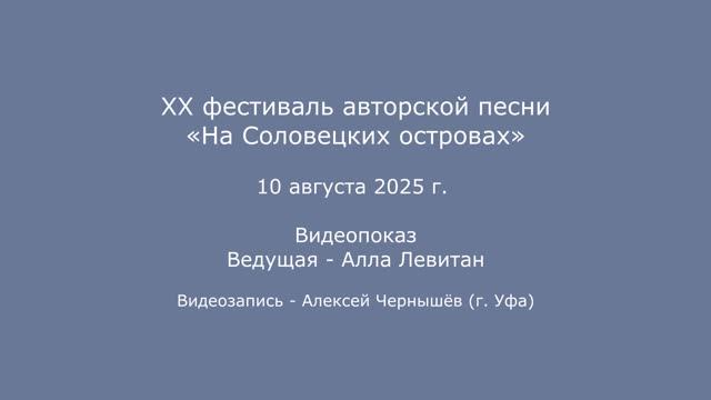 XX фестиваль авторской песни «На Соловецких островах». 10-11 августа 2025 г. Видеопоказы. Ведущая - Алла Левитан. Видеозапись - Алексей Чернышёв (г. Уфа).