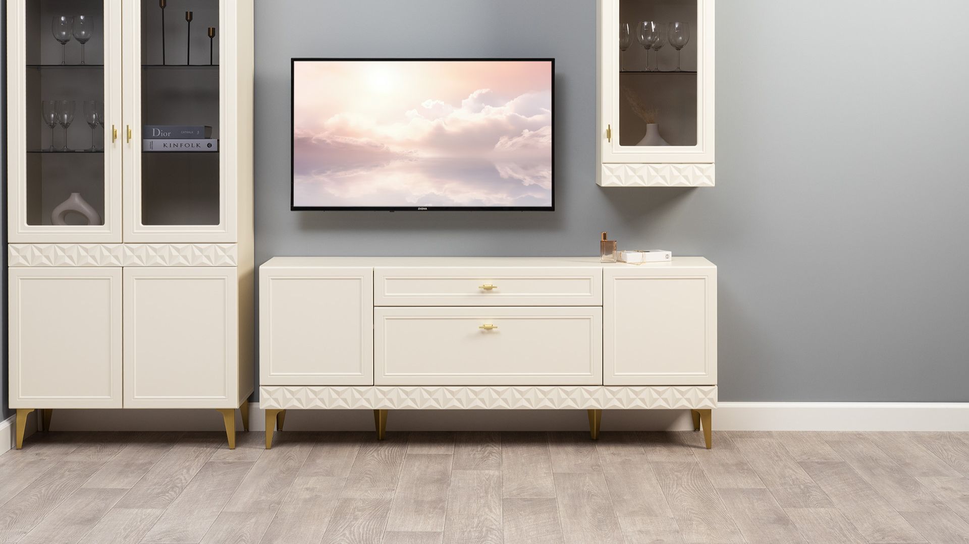 Коллекция «Марион» — воплощение изысканной классики. Изящные линии, глубокая фрезеровка фасадов из МДФ и благородные оттенки. Утончённая «Слоновая кость» и изысканная «Олива Шагрень» с глубоким зелёным тоном — создают атмосферу уюта, тепла и благородства. Металлические ручки и опоры золотого цвета придают мебели утончённый блеск, а петли и направляющие с доводчиками обеспечивают плавное и бесшумное закрытие фасадов. В коллекции представлены три типа витрин с тонированным закалённым стеклом, которые придают пространству лёгкость и свет. «Марион» — идеальное сочетание традиций и актуального дизайна в каждой детали.